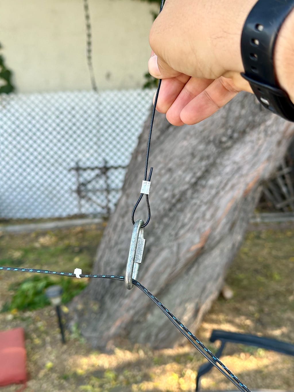 - I measured out and attached a long piece of guy line rope and built the antenna in place around chest height with the pulley lines all down