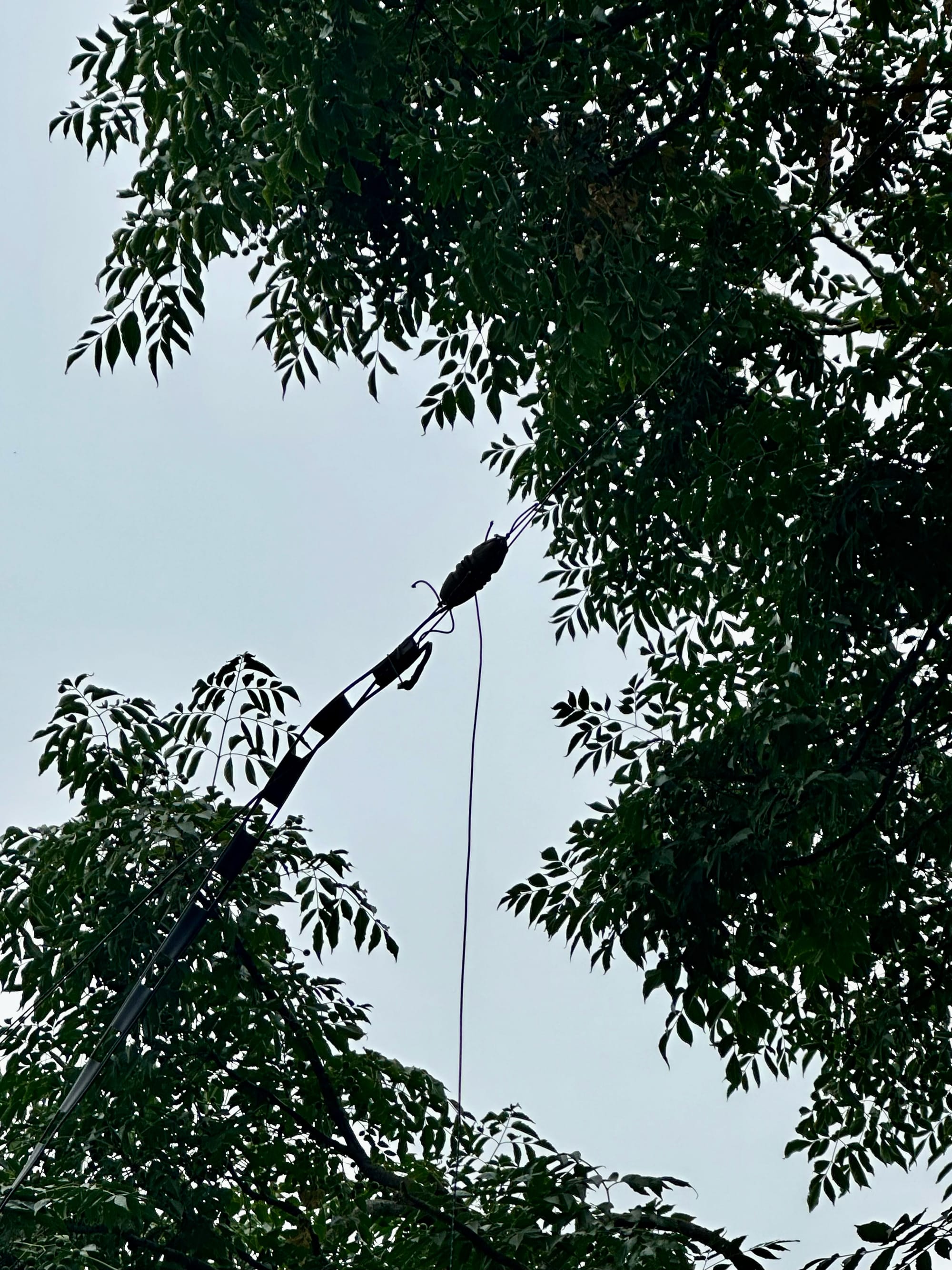 - 20-25 throws of my arborist throwing bag high into the tree finally landed me where I wanted to be. I used that to pull through some guy line rope which then once over I put a D-ring on that would hold the highest part of my antenna up