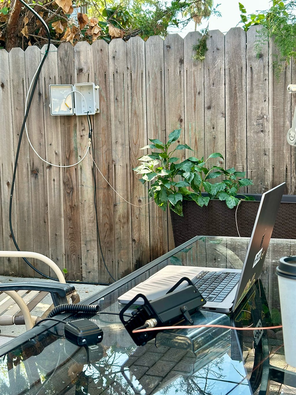 - I installed a little plastic box where two pieces of coax met, so that I can sit in the patio with my beloved Elecraft KX2 and inject it when desired. (See below)